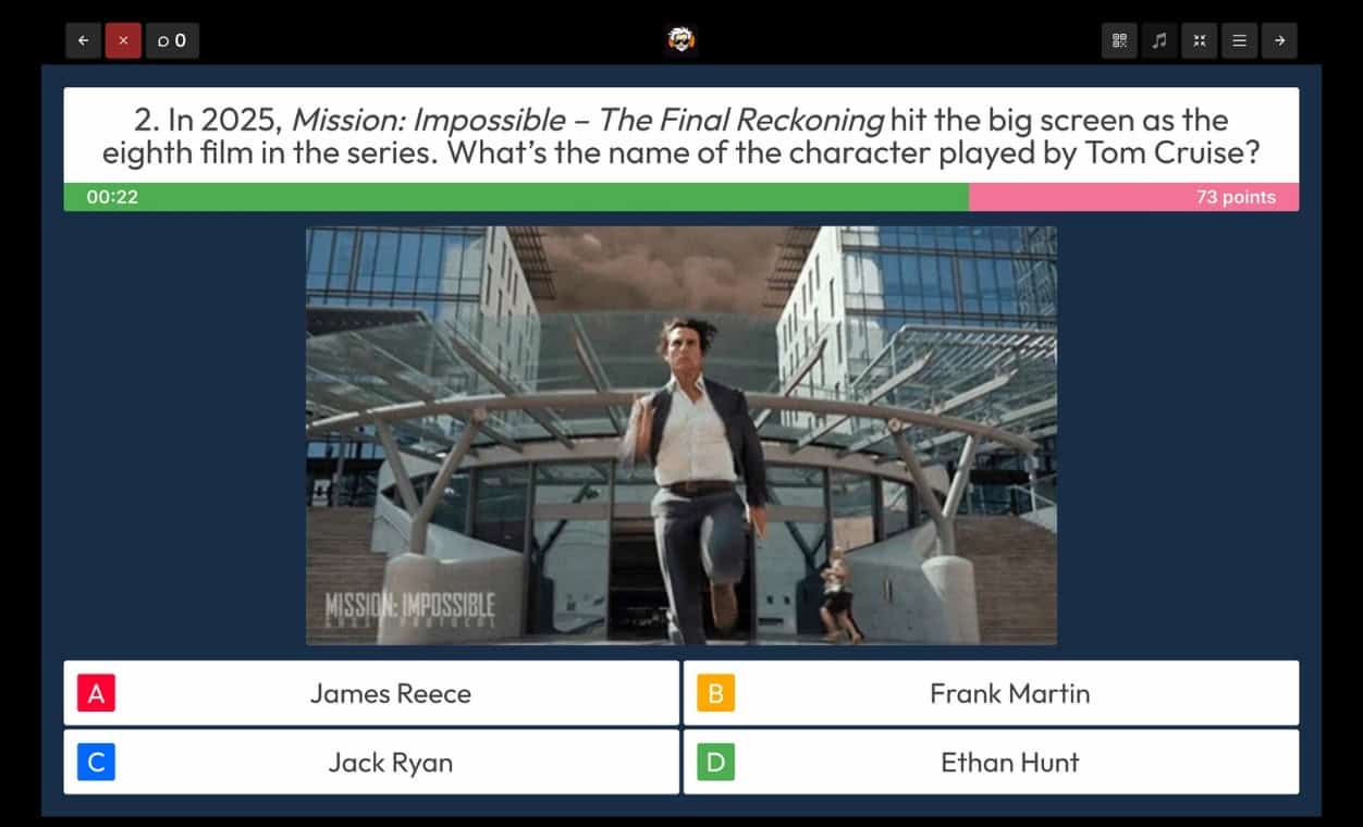 Iedere speler doet mee via z’n eigen smartphone. Even verbinden met de Quiz en je kunt direct live antwoorden geven.