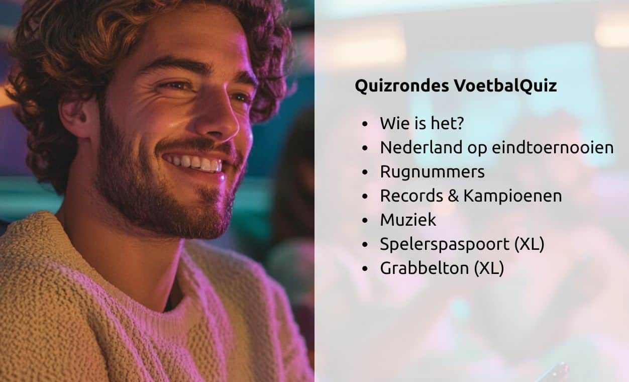 Afhankelijk van de versie die je kiest, krijg je 40 quizvragen (Standaard Quiz) of 70 quizvragen (XL Quiz). Hieronder zie je welke rondes je kunt verwachten!
